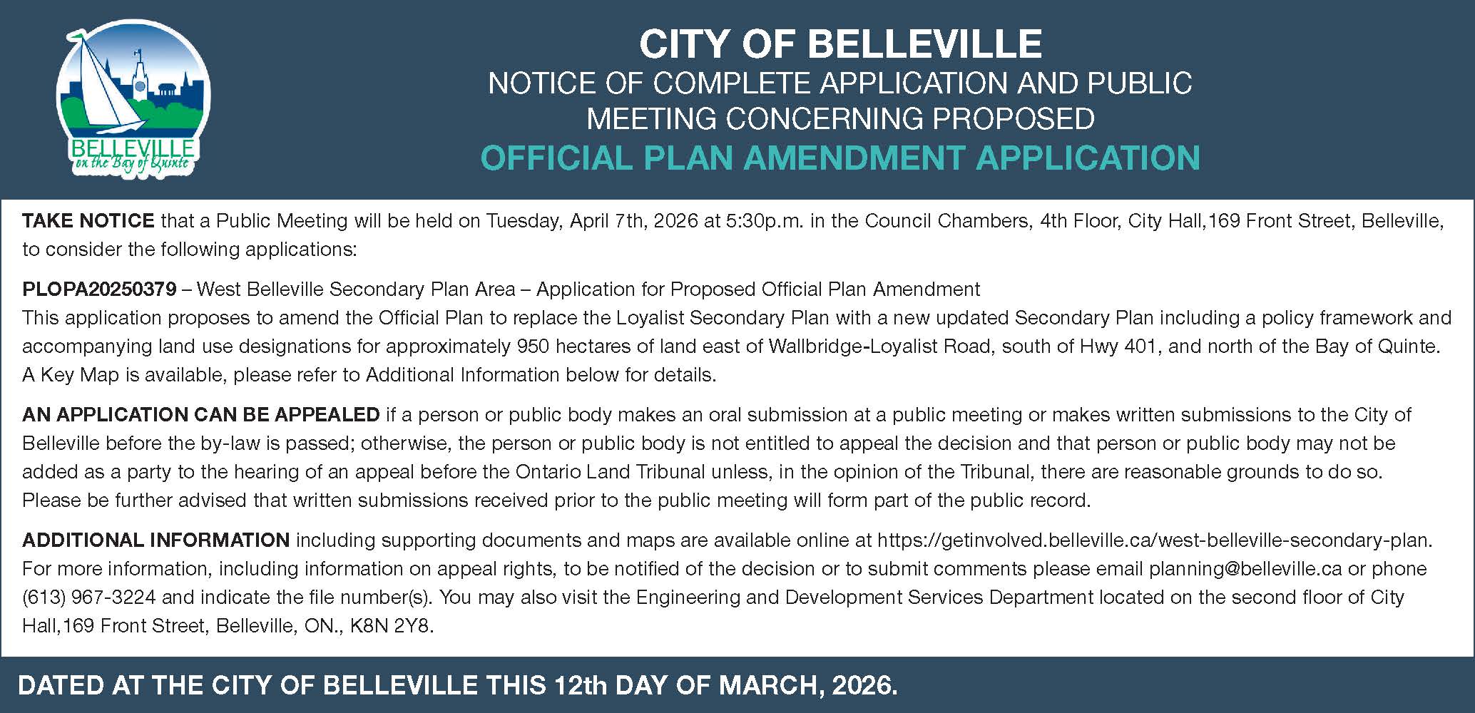The City of Belleville is revising its Loyalist Secondary Plan, a long-term planning strategy for approximately 950 hectares of land east of Wallbridge‑Loyalist Road, south of Hwy 401, and north of the Bay of Quinte, to guide substantial future growth and development.